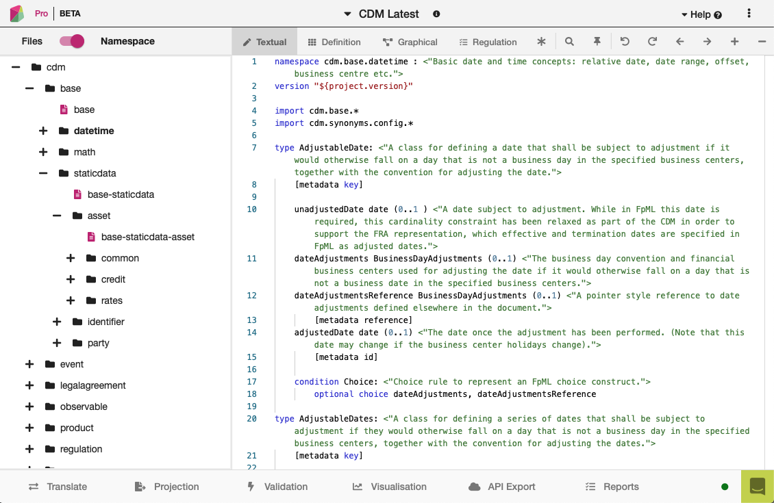 The CDM is partitioned into groups of namespaces. A namespace is an abstract container created to hold a logical grouping of model artefacts. The approach is designed to make it easier for users to understand the model structure and adopt selected components. It also aids the development cycle by insulating groups of components from unrelated model changes that may occur. The partitioning is visible to users in Rosetta Core by toggling the Namespace view in the left hand panel, and in the generated code files.